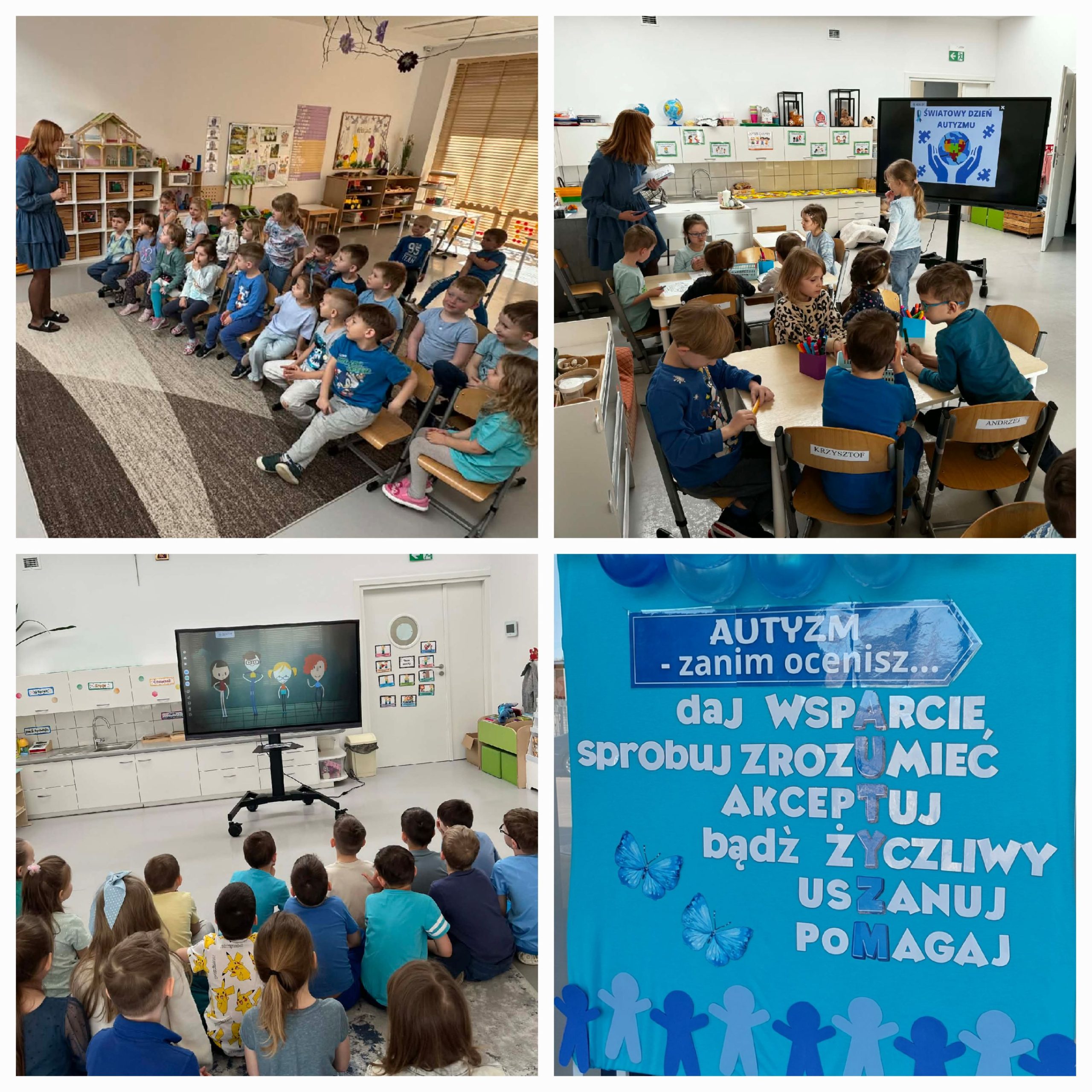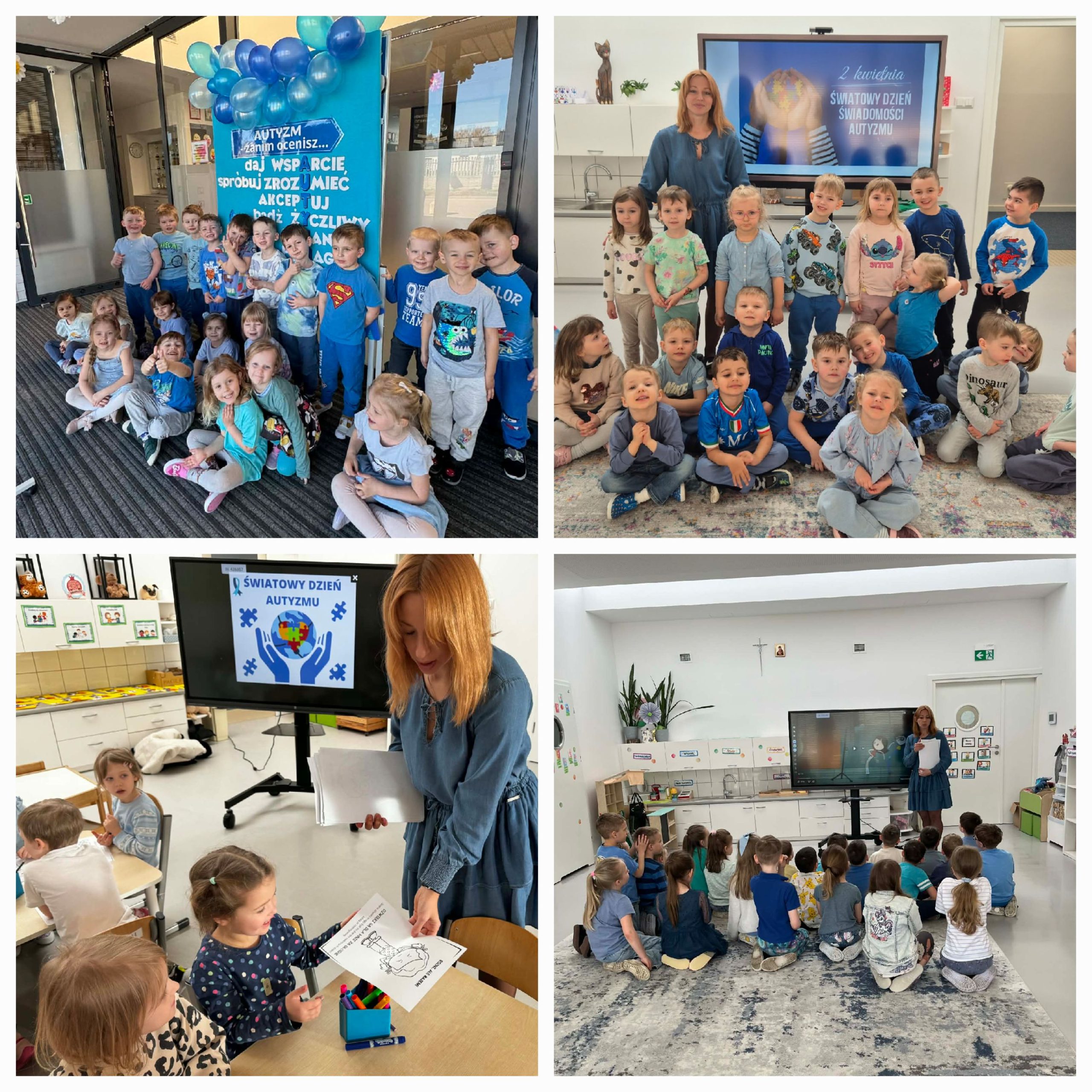 W związku z Światowym Dniem Autyzmu w naszym przedszkolu odbyły się zajęcia które miały na celu kształtowanie u dzieci postawy akceptacji i empatii oraz rozwijanie świadomości, że ludzie różnią się między sobą. W sposób dostosowany do wieku wprowadzono pojęcie autyzmu, zwracając uwagę na to, że niektóre osoby mogą inaczej odbierać świat, np. dźwięki czy emocje. Podczas zajęć dzieci uczyły się, że każdy może mieć inny sposób zabawy i zachowania, a mimo to wszyscy zasługują na szacunek i życzliwość.